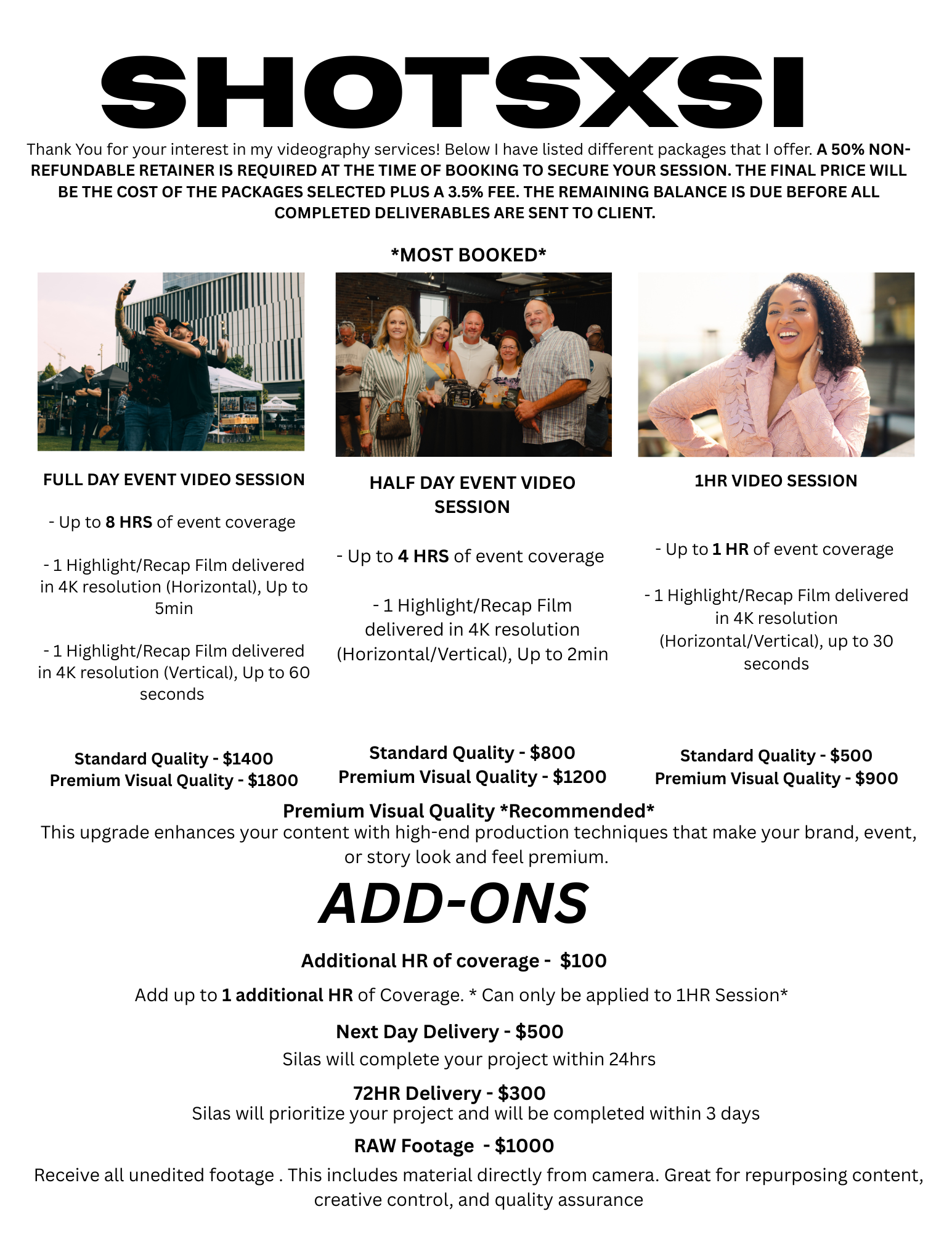 Thank You for your interest in my event videography services! Below I have listed different packages that I offer. A 50% NON-REFUNDABLE RETAINER IS REQUIRED AT THE TIME OF BOOKING TO SECURE YOUR SESSION. THE FINAL PRICE WILL BE THE COST OF THE PACKAGES SELECTED PLUS A 3.5% FEE. THE REMAINING BALANCE IS DUE THE DAY OF YOUR SESSION. PAYMENT PLANS AVAILABLE!